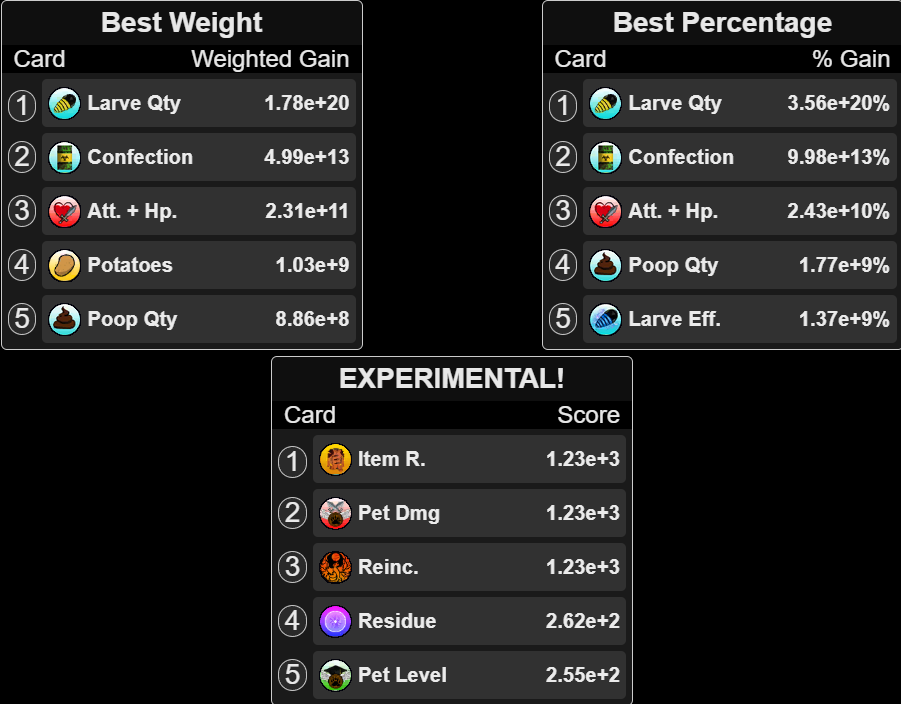 currently in progress but still tends to show the best suggestions. The second best is "Best Weight", which can be useful in lower ascensions.