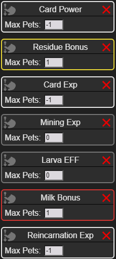 2) The priority list is made up of blocks that has a value from -1 to 6. A value of -1 means you want as many pets including this bonus, a pet always